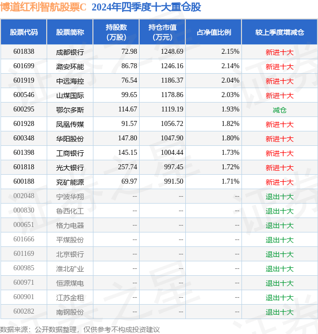 从基金规模来看,博道红利智航股票C基金2024年四季度公布的基金规模为2.08亿元,较上一期规模3.48亿元变化了-1.4亿元,环比变化了-40.16%。该基金最新一期资产配置为:股票占净值比91.76%,债券占净值比4.78%,现金占净值比0.65%。从基金持仓来看,该基金当季前十大股票仓位达19.07%,第一大重仓股为成都银行(601838),持仓占比为2.15%。