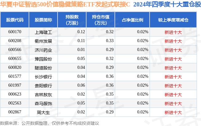 从基金规模来看,华夏中证智选500价值稳健策略ETF发起式联接C基金2024年四季度公布的基金规模为0.02亿元,较上一期规模498.29万元变化了-251.97万元,环比变化了-50.57%。该基金最新一期资产配置为:股票占净值比1.2%,债券占净值比0.69%,现金占净值比4.49%。从基金持仓来看,该基金当季前十大股票仓位达0.2%,第一大重仓股为上海建工(600170),持仓占比为0.02%。