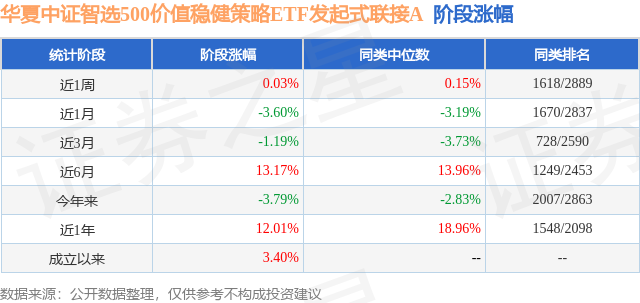 从业绩表现来看,华夏中证智选500价值稳健策略ETF发起式联接A基金过去一年净值涨幅为12.01%,在同类基金中排名1548/2098,同类基金过去一年净值涨幅中位数为18.96%。而基金过去一年的最大回撤为-18.17%,成立以来的最大回撤为-18.17%。