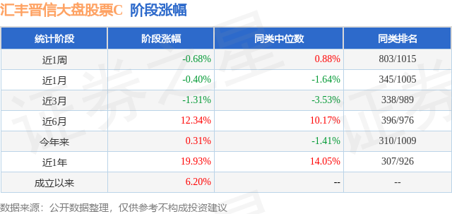 从业绩表现来看,汇丰晋信大盘股票C基金过去一年净值涨幅为19.93%,在同类基金中排名307/926,同类基金过去一年净值涨幅中位数为14.05%。而基金过去一年的最大回撤为-18.21%,成立以来的最大回撤为-18.88%。