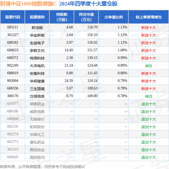 从基金规模来看,财通中证1000指数增强C基金2024年四季度公布的基金规模为1.13亿元,较上一期规模1.8亿元变化了-6775.95万元,环比变化了-37.57%。该基金最新一期资产配置为:股票占净值比88.62%,无债券类资产,现金占净值比11.9%。从基金持仓来看,该基金当季前十大股票仓位达9.48%,第一大重仓股为新洁能(605111),持仓占比为1.13%。