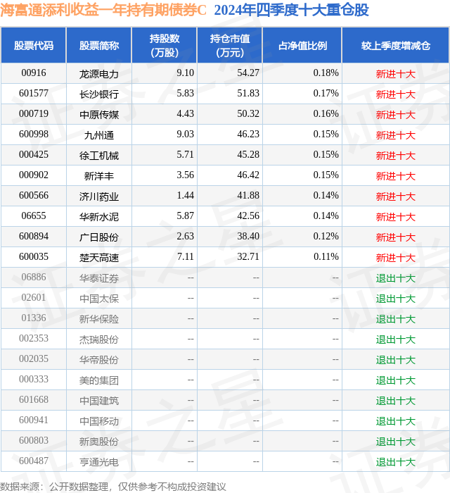从基金规模来看,海富通添利收益一年持有期债券C基金2024年四季度公布的基金规模为0.89亿元,较上一期规模1.42亿元变化了-5302.33万元,环比变化了-37.27%。该基金最新一期资产配置为:股票占净值比7.11%,债券占净值比96.49%,现金占净值比4.99%。从基金持仓来看,该基金当季前十大股票仓位达1.47%,第一大重仓股为龙源电力(00916),持仓占比为0.18%。