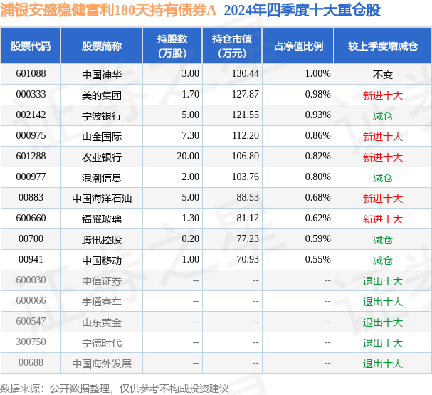 从基金规模来看,浦银安盛稳健富利180天持有债券A基金2024年四季度公布的基金规模为0.55亿元,较上一期规模6513.34万元变化了-994.05万元,环比变化了-15.26%。该基金最新一期资产配置为:股票占净值比16.33%,债券占净值比94.28%,现金占净值比1.57%。从基金持仓来看,该基金当季前十大股票仓位达7.83%,第一大重仓股为中国神华(601088),持仓占比为1.0%。