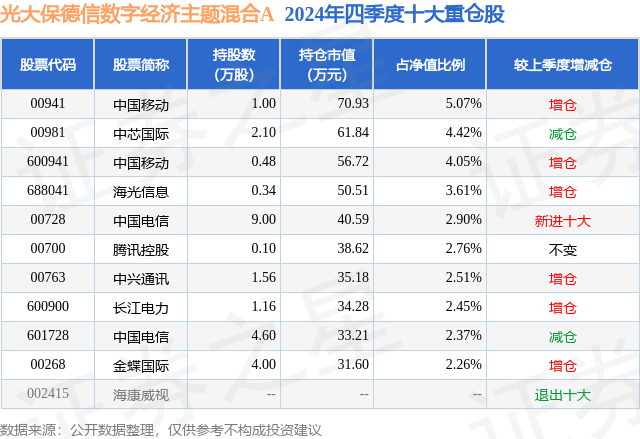 从基金规模来看,光大保德信数字经济主题混合A基金2024年四季度公布的基金规模为0.12亿元,较上一期规模1125.52万元变化了81.29万元,环比变化了7.22%。该基金最新一期资产配置为:股票占净值比75.41%,债券占净值比5.79%,现金占净值比11.7%。从基金持仓来看,该基金当季前十大股票仓位达32.4%,第一大重仓股为中国移动(00941),持仓占比为5.07%。