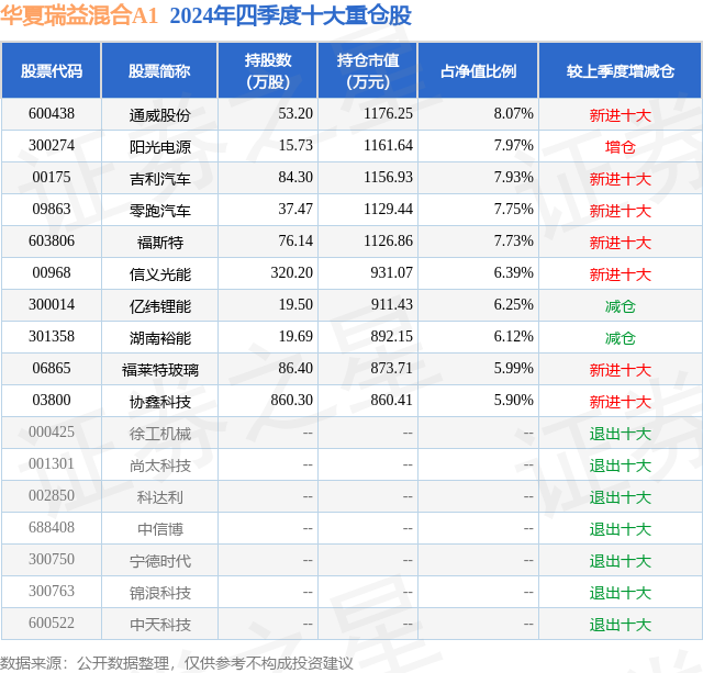 从基金规模来看,华夏瑞益混合A1基金2024年四季度公布的基金规模为1.35亿元,较上一期规模1.48亿元变化了-1316.64万元,环比变化了-8.87%。该基金最新一期资产配置为:股票占净值比93.77%,无债券类资产,现金占净值比6.65%。从基金持仓来看,该基金当季前十大股票仓位达70.1%,第一大重仓股为通威股份(600438),持仓占比为8.07%。