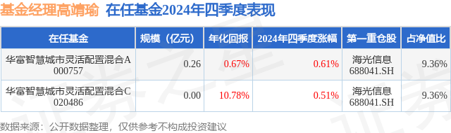 从基金规模来看,华富智慧城市灵活配置混合C基金2024年四季度公布的基金规模为0.0亿元,较上一期规模7.53万元变化了5.02万元,环比变化了66.69%。该基金最新一期资产配置为:股票占净值比91.32%,无债券类资产,现金占净值比7.06%。从基金持仓来看,该基金当季前十大股票仓位达43.24%,第一大重仓股为海光信息(688041),持仓占比为9.36%。