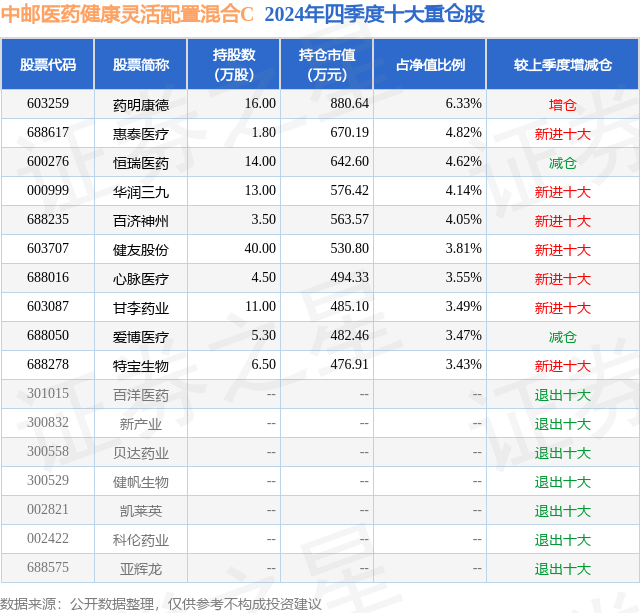 证券之星消息,日前中邮医药健康灵活配置混合C基金公布四季报,2024年四季度最新规模0.21亿元,季度净值涨幅为-12.06%。