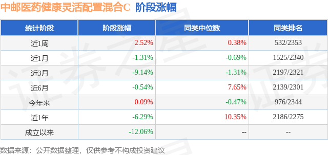 从业绩表现来看,中邮医药健康灵活配置混合C基金过去一年净值涨幅为-6.29%,在同类基金中排名2186/2275,同类基金过去一年净值涨幅中位数为10.35%。而基金过去一年的最大回撤为-22.69%,成立以来的最大回撤为-22.69%。