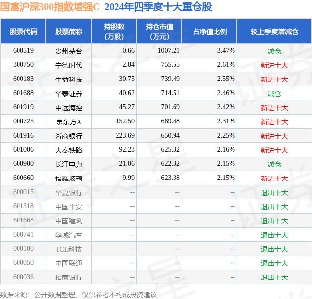 从基金规模来看,国富沪深300指数增强C基金2024年四季度公布的基金规模为0.06亿元,较上一期规模538.28万元变化了64.65万元,环比变化了12.01%。该基金最新一期资产配置为:股票占净值比90.28%,无债券类资产,现金占净值比10.11%。从基金持仓来看,该基金当季前十大股票仓位达24.53%,第一大重仓股为贵州茅台(600519),持仓占比为3.47%。