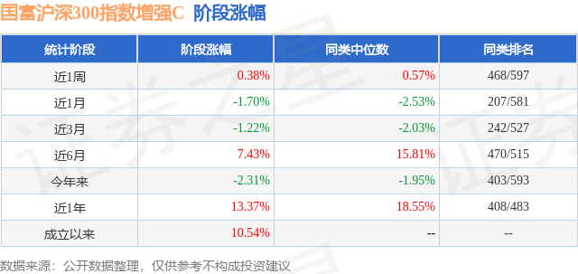 从业绩表现来看,国富沪深300指数增强C基金过去一年净值涨幅为13.37%,在同类基金中排名408/483,同类基金过去一年净值涨幅中位数为18.55%。而基金过去一年的最大回撤为-14.06%,成立以来的最大回撤为-14.06%。