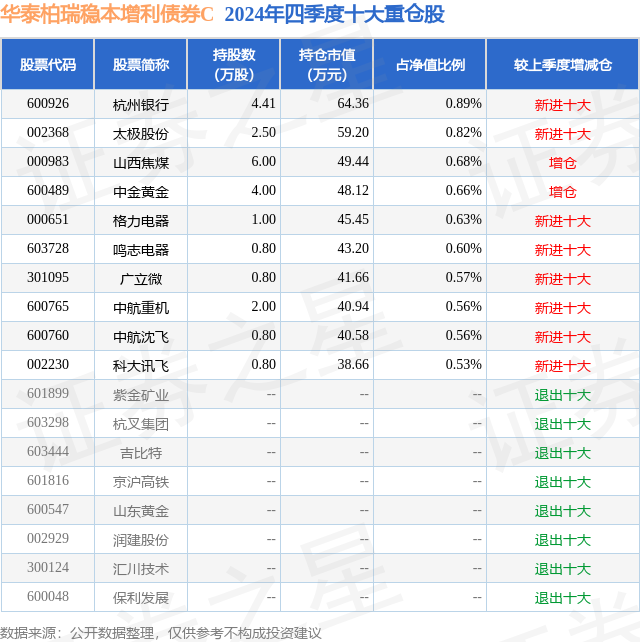 从基金规模来看,华泰柏瑞稳本增利债券C基金2024年四季度公布的基金规模为0.0亿元,较上一期规模13.07万元变化了-4.98万元,环比变化了-38.1%。该基金最新一期资产配置为:股票占净值比8.35%,债券占净值比92.63%,现金占净值比3.38%。从基金持仓来看,该基金当季前十大股票仓位达6.5%,第一大重仓股为杭州银行(600926),持仓占比为0.89%。