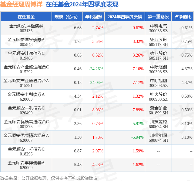金元顺安丰利债券C现任基金经理为周博洋。其中在任基金经理周博洋已从业7年,2024年1月3日正式接手管理金元顺安丰利债券C,任职期间累计回报为8.69%。目前还管理着11只基金产品(包括A类和C类),其中本季度表现最佳的基金为金元顺安丰利债券C(020499),季度净值涨幅为7.89%。