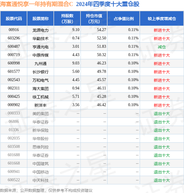 从基金规模来看,海富通悦享一年持有期混合C基金2024年四季度公布的基金规模为1.79亿元,较上一期规模1.88亿元变化了-826.78万元,环比变化了-4.41%。该基金最新一期资产配置为:股票占净值比5.85%,债券占净值比89.8%,现金占净值比1.69%。从基金持仓来看,该基金当季前十大股票仓位达1.04%,第一大重仓股为龙源电力(00916),持仓占比为0.11%。