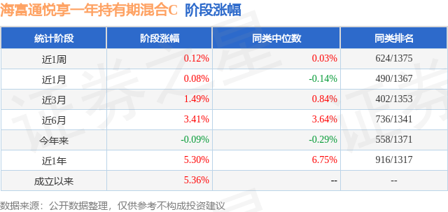 从业绩表现来看,海富通悦享一年持有期混合C基金过去一年净值涨幅为5.3%,在同类基金中排名916/1317,同类基金过去一年净值涨幅中位数为6.75%。而基金过去一年的最大回撤为-1.97%,成立以来的最大回撤为-1.97%。