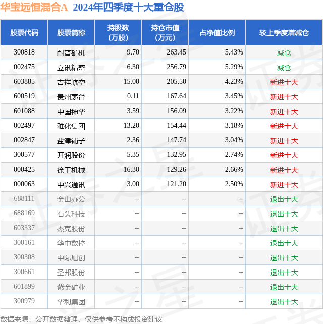 证券之星消息,日前华宝远恒混合A基金公布四季报,2024年四季度最新规模0.26亿元,季度净值涨幅为-1.94%。
