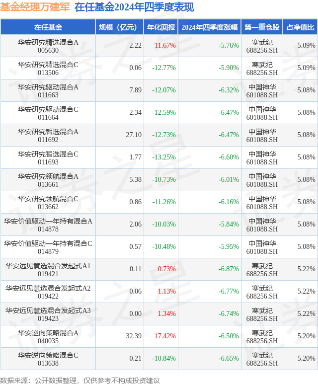从基金规模来看,华安远见慧选混合发起式A1基金2024年四季度公布的基金规模为0.11亿元,较上一期规模2232.14万元变化了-1134.19万元,环比变化了-50.81%。该基金最新一期资产配置为:股票占净值比76.87%,无债券类资产,现金占净值比26.02%。从基金持仓来看,该基金当季前十大股票仓位达33.25%,第一大重仓股为寒武纪(688256),持仓占比为5.22%。
