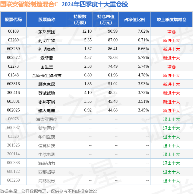 从基金规模来看,国联安智能制造混合C基金2024年四季度公布的基金规模为0.04亿元,较上一期规模429.86万元变化了-26.61万元,环比变化了-6.19%。该基金最新一期资产配置为:股票占净值比89.44%,无债券类资产,现金占净值比9.34%。从基金持仓来看,该基金当季前十大股票仓位达51.31%,第一大重仓股为东岳集团(00189),持仓占比为7.02%。