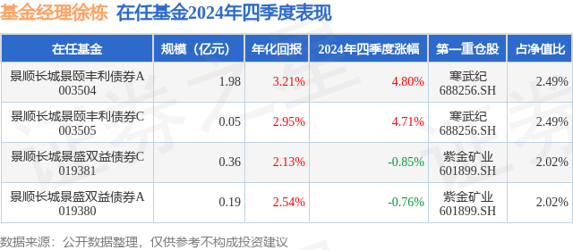 从基金规模来看,景顺长城景盛双益债券A基金2024年四季度公布的基金规模为0.19亿元,较上一期规模6493.14万元变化了-4597.39万元,环比变化了-70.8%。该基金最新一期资产配置为:股票占净值比4.34%,债券占净值比82.11%,现金占净值比13.58%。从基金持仓来看,该基金当季前十大股票仓位达4.34%,第一大重仓股为紫金矿业(601899),持仓占比为2.02%。