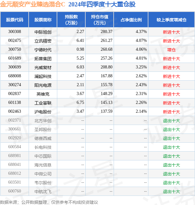 从基金规模来看,金元顺安产业臻选混合C基金2024年四季度公布的基金规模为0.46亿元,较上一期规模5745.5万元变化了-1130.55万元,环比变化了-19.68%。该基金最新一期资产配置为:股票占净值比80.93%,债券占净值比6.15%,现金占净值比5.62%。从基金持仓来看,该基金当季前十大股票仓位达31.52%,第一大重仓股为中际旭创(300308),持仓占比为4.37%。