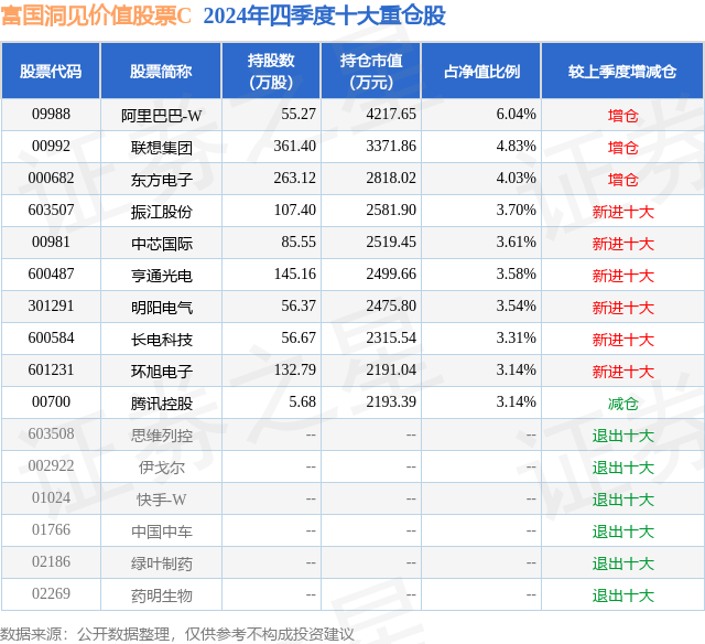 从基金规模来看,富国洞见价值股票C基金2024年四季度公布的基金规模为2.51亿元,较上一期规模2.6亿元变化了-901.81万元,环比变化了-3.47%。该基金最新一期资产配置为:股票占净值比89.15%,债券占净值比0.06%,现金占净值比12.0%。从基金持仓来看,该基金当季前十大股票仓位达38.92%,第一大重仓股为阿里巴巴-W(09988),持仓占比为6.04%。