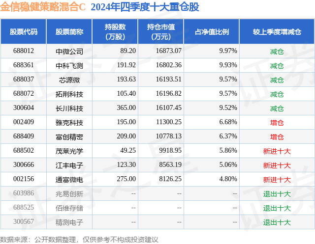 从基金规模来看,金信稳健策略混合C基金2024年四季度公布的基金规模为0.0亿元,较上一期规模2156.28万元变化了-2156.27万元,环比变化了-100.0%。该基金最新一期资产配置为:股票占净值比93.71%,债券占净值比4.65%,现金占净值比2.68%。从基金持仓来看,该基金当季前十大股票仓位达77.33%,第一大重仓股为中微公司(688012),持仓占比为9.97%。