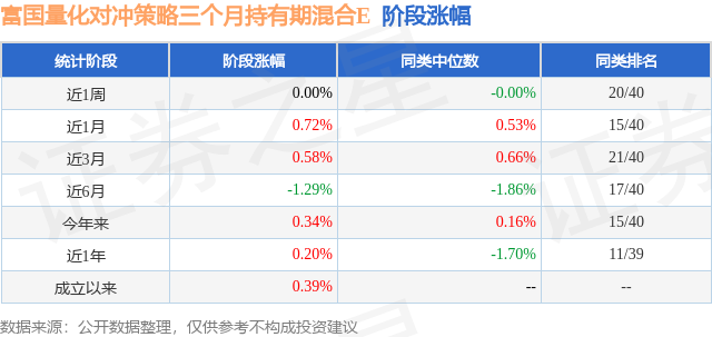 从业绩表现来看,富国量化对冲策略三个月持有期混合E基金过去一年净值涨幅为0.2%,在同类基金中排名11/39,同类基金过去一年净值涨幅中位数为-1.7%。而基金过去一年的最大回撤为-4.08%,成立以来的最大回撤为-4.08%。