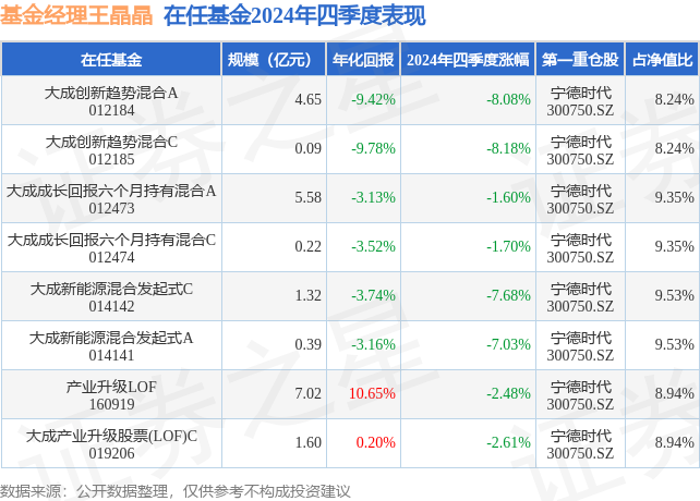 从基金规模来看,大成产业升级股票(LOF)C基金2024年四季度公布的基金规模为1.6亿元,较上一期规模3.2亿元变化了-1.6亿元,环比变化了-49.97%。该基金最新一期资产配置为:股票占净值比87.22%,债券占净值比3.27%,现金占净值比9.59%。从基金持仓来看,该基金当季前十大股票仓位达66.92%,第一大重仓股为宁德时代(300750),持仓占比为8.94%。