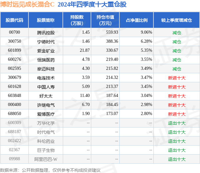 从基金规模来看,博时远见成长混合C基金2024年四季度公布的基金规模为0.06亿元,较上一期规模2163.34万元变化了-1548.76万元,环比变化了-71.59%。该基金最新一期资产配置为:股票占净值比84.65%,无债券类资产,现金占净值比16.02%。从基金持仓来看,该基金当季前十大股票仓位达43.47%,第一大重仓股为腾讯控股(00700),持仓占比为9.06%。