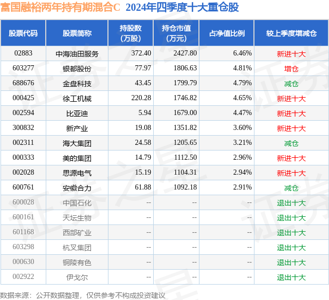 从基金规模来看,富国融裕两年持有期混合C基金2024年四季度公布的基金规模为2.32亿元,较上一期规模2.57亿元变化了-2437.61万元,环比变化了-9.49%。该基金最新一期资产配置为:股票占净值比82.95%,债券占净值比2.7%,现金占净值比15.04%。从基金持仓来看,该基金当季前十大股票仓位达40.8%,第一大重仓股为中海油田服务(02883),持仓占比为6.46%。
