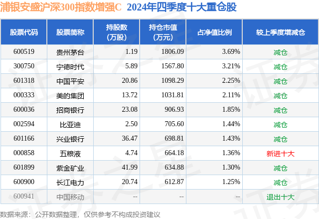 从基金规模来看,浦银安盛沪深300指数增强C基金2024年四季度公布的基金规模为0.7亿元,较上一期规模1.85亿元变化了-1.15亿元,环比变化了-61.93%。该基金最新一期资产配置为:股票占净值比93.8%,无债券类资产,现金占净值比6.42%。从基金持仓来看,该基金当季前十大股票仓位达19.89%,第一大重仓股为贵州茅台(600519),持仓占比为3.69%。