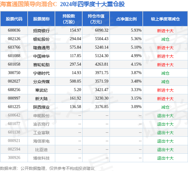 证券之星消息,日前海富通国策导向混合C基金公布四季报,2024年四季度最新规模0.56亿元,季度净值涨幅为-3.16%。