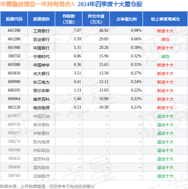从基金规模来看,华夏稳进增益一年持有混合A基金2024年四季度公布的基金规模为0.26亿元,较上一期规模4383.35万元变化了-1792.7万元,环比变化了-40.9%。该基金最新一期资产配置为:股票占净值比15.15%,债券占净值比57.1%,现金占净值比66.06%。从基金持仓来看,该基金当季前十大股票仓位达3.95%,第一大重仓股为工商银行(601398),持仓占比为0.98%。