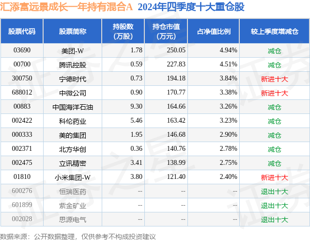 证券之星消息,日前汇添富远景成长一年持有混合A基金公布四季报,2024年四季度最新规模0.46亿元,季度净值涨幅为-4.89%。