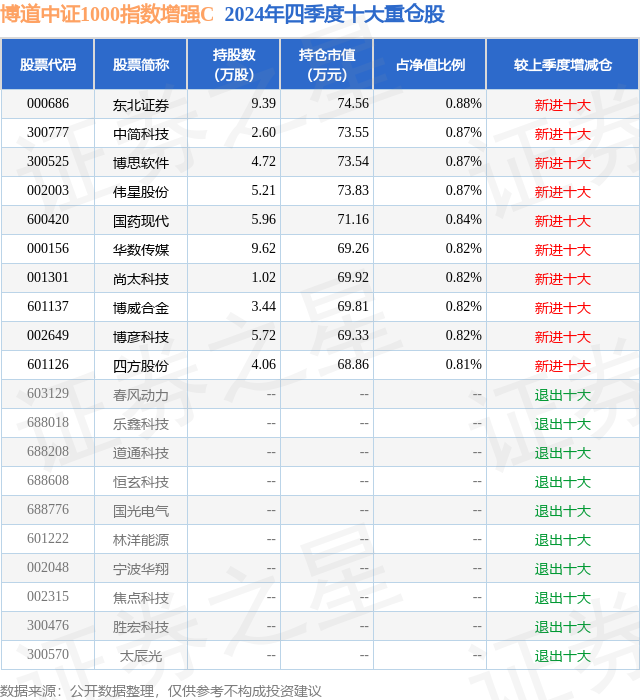 从基金规模来看,博道中证1000指数增强C基金2024年四季度公布的基金规模为0.07亿元,较上一期规模614.72万元变化了44.1万元,环比变化了7.17%。该基金最新一期资产配置为:股票占净值比95.01%,债券占净值比5.03%,现金占净值比1.44%。从基金持仓来看,该基金当季前十大股票仓位达8.42%,第一大重仓股为东北证券(000686),持仓占比为0.88%。
