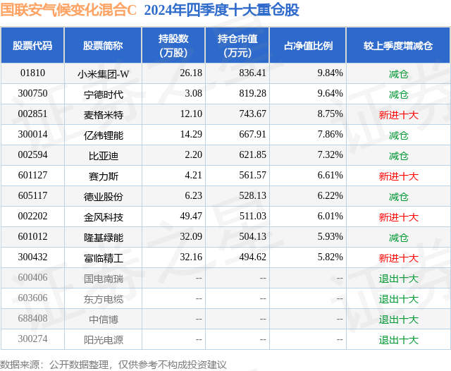 从基金规模来看,国联安气候变化混合C基金2024年四季度公布的基金规模为0.0亿元,较上一期规模16.78万元变化了-13.16万元,环比变化了-78.41%。该基金最新一期资产配置为:股票占净值比88.55%,无债券类资产,现金占净值比11.31%。从基金持仓来看,该基金当季前十大股票仓位达74.0%,第一大重仓股为小米集团-W(01810),持仓占比为9.84%。
