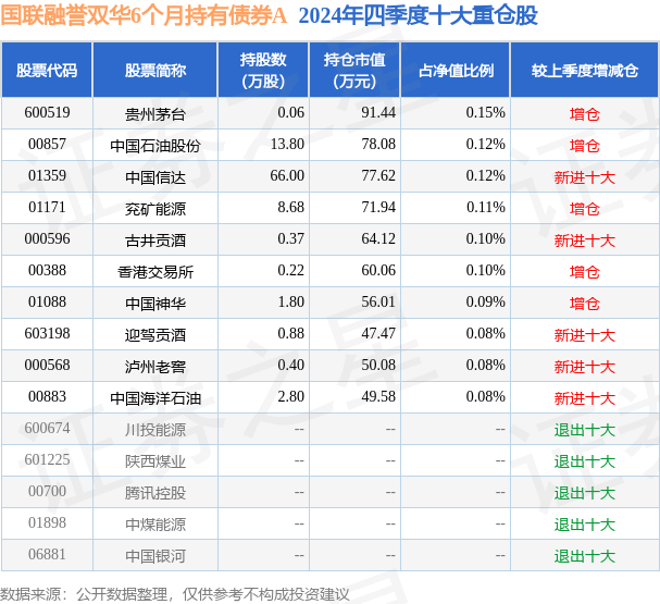 从基金规模来看,国联融誉双华6个月持有债券A基金2024年四季度公布的基金规模为4.81亿元,较上一期规模5105.56万元变化了4.3亿元,环比变化了842.28%。该基金最新一期资产配置为:股票占净值比3.53%,债券占净值比117.11%,现金占净值比1.26%。从基金持仓来看,该基金当季前十大股票仓位达1.03%,第一大重仓股为贵州茅台(600519),持仓占比为0.15%。