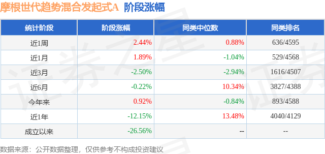 从业绩表现来看,摩根世代趋势混合发起式A基金过去一年净值涨幅为-12.15%,在同类基金中排名4040/4129,同类基金过去一年净值涨幅中位数为13.48%。而基金过去一年的最大回撤为-24.59%,成立以来的最大回撤为-33.85%。