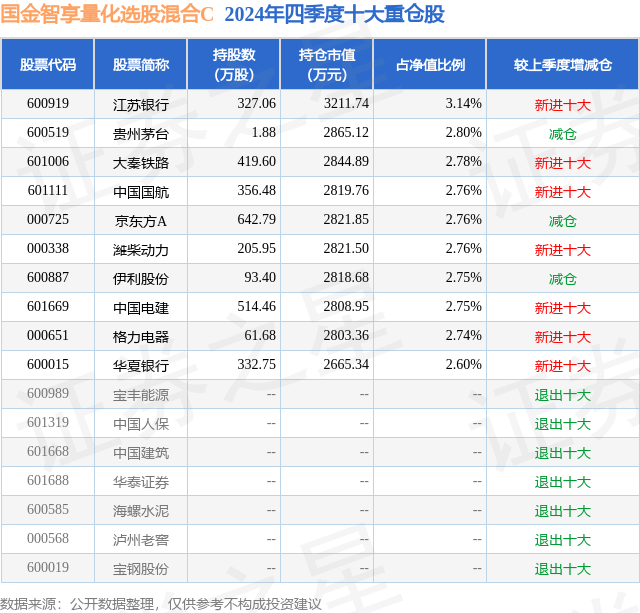 从基金规模来看,国金智享量化选股混合C基金2024年四季度公布的基金规模为5.75亿元,较上一期规模6.92亿元变化了-1.17亿元,环比变化了-16.93%。该基金最新一期资产配置为:股票占净值比89.01%,无债券类资产,现金占净值比11.49%。从基金持仓来看,该基金当季前十大股票仓位达27.84%,第一大重仓股为江苏银行(600919),持仓占比为3.14%。