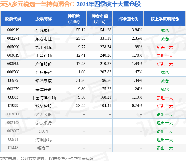 证券之星消息,日前天弘多元锐选一年持有混合C基金公布四季报,2024年四季度最新规模0.81亿元,季度净值涨幅为2.18%。