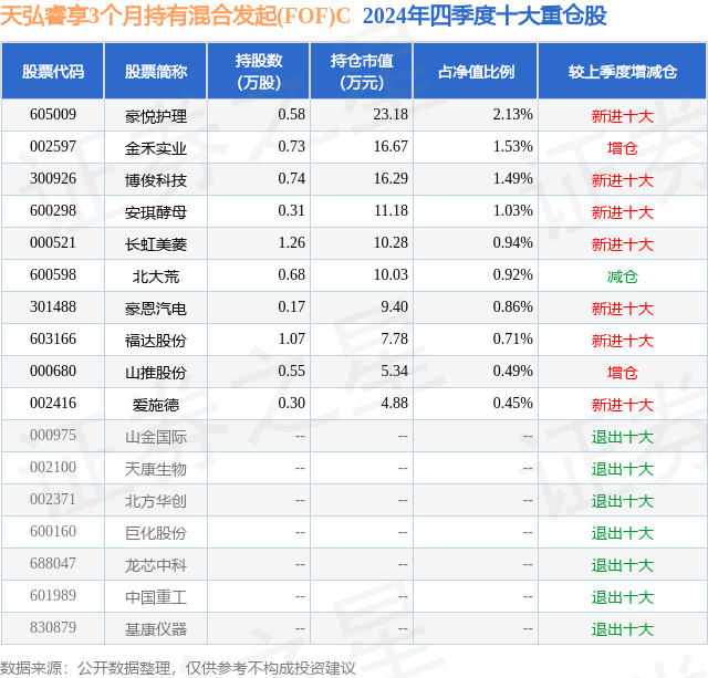 从基金规模来看,天弘睿享3个月持有混合发起(FOF)C基金2024年四季度公布的基金规模为0.05亿元,较上一期规模549.07万元变化了-27.85万元,环比变化了-5.07%。该基金最新一期资产配置为:股票占净值比11.65%,债券占净值比5.94%,现金占净值比6.49%。从基金持仓来看,该基金当季前十大股票仓位达10.55%,第一大重仓股为豪悦护理(605009),持仓占比为2.13%。