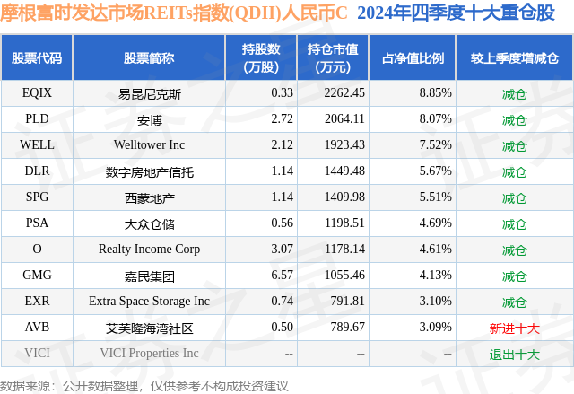 从基金规模来看,摩根富时发达市场REITs指数(QDII)人民币C基金2024年四季度公布的基金规模为0.13亿元,较上一期规模810.54万元变化了503.24万元,环比变化了62.09%。该基金最新一期资产配置为:无股票类资产,无债券类资产,现金占净值比8.78%。从基金持仓来看,该基金当季前十大股票仓位达55.24%,第一大重仓股为易昆尼克斯(EQIX),持仓占比为8.85%。