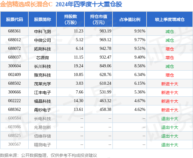 从基金规模来看,金信精选成长混合C基金2024年四季度公布的基金规模为0.74亿元,较上一期规模6415.46万元变化了979.21万元,环比变化了15.26%。该基金最新一期资产配置为:股票占净值比94.0%,债券占净值比4.49%,现金占净值比3.07%。从基金持仓来看,该基金当季前十大股票仓位达74.29%,第一大重仓股为中科飞测(688361),持仓占比为9.91%。