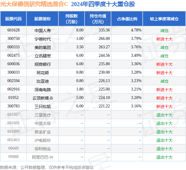 证券之星消息,日前光大保德信研究精选混合C基金公布四季报,2024年四季度最新规模0.0亿元,季度净值涨幅为-7.35%。