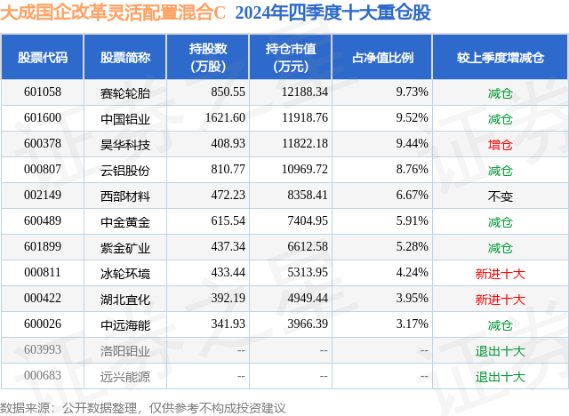 从基金规模来看,大成国企改革灵活配置混合C基金2024年四季度公布的基金规模为0.33亿元,较上一期规模1.13亿元变化了-8036.2万元,环比变化了-71.17%。该基金最新一期资产配置为:股票占净值比89.65%,无债券类资产,现金占净值比10.31%。从基金持仓来看,该基金当季前十大股票仓位达66.67%,第一大重仓股为赛轮轮胎(601058),持仓占比为9.73%。