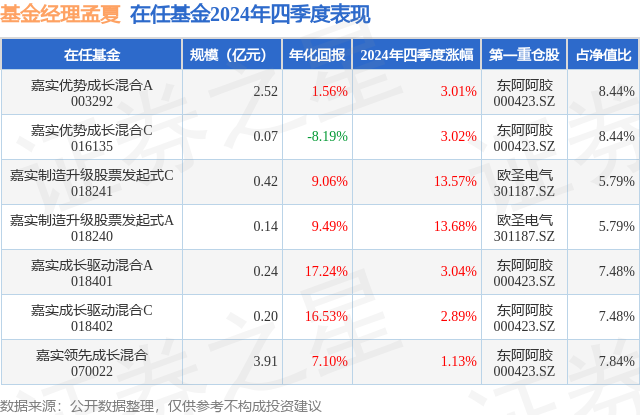 从基金规模来看,嘉实成长驱动混合A基金2024年四季度公布的基金规模为0.24亿元,较上一期规模2224.69万元变化了189.11万元,环比变化了8.5%。该基金最新一期资产配置为:股票占净值比76.49%,债券占净值比4.34%,现金占净值比20.77%。从基金持仓来看,该基金当季前十大股票仓位达44.18%,第一大重仓股为东阿阿胶(000423),持仓占比为7.48%。