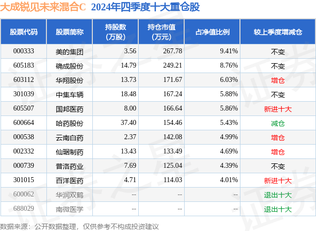 证券之星消息,日前大成锐见未来混合C基金公布四季报,2024年四季度最新规模0.02亿元,季度净值涨幅为-6.91%。