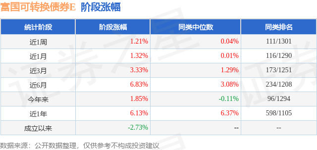 从业绩表现来看,富国可转换债券E基金过去一年净值涨幅为6.13%,在同类基金中排名598/1105,同类基金过去一年净值涨幅中位数为6.37%。而基金过去一年的最大回撤为-13.32%,成立以来的最大回撤为-15.62%。