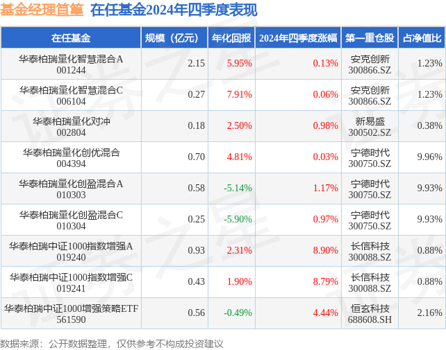 证券之星消息,日前华泰柏瑞中证1000指数增强C基金公布四季报,2024年四季度最新规模0.43亿元,季度净值涨幅为8.79%。