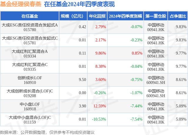 从基金规模来看,大成创新成长混合(LOF)C基金2024年四季度公布的基金规模为0.0亿元,较上一期规模18.69万元变化了1.18万元,环比变化了6.33%。该基金最新一期资产配置为:股票占净值比76.86%,无债券类资产,现金占净值比23.42%。从基金持仓来看,该基金当季前十大股票仓位达44.76%,第一大重仓股为中国移动(600941),持仓占比为8.61%。