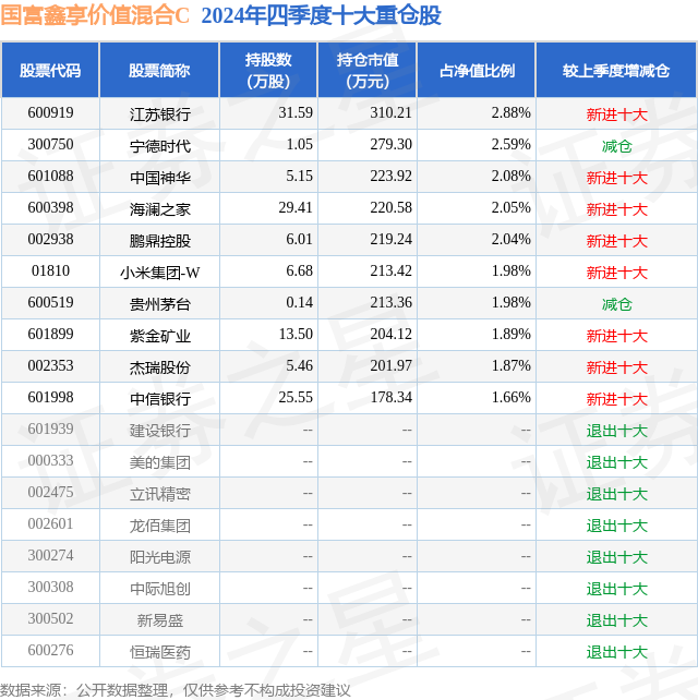 从基金规模来看,国富鑫享价值混合C基金2024年四季度公布的基金规模为0.36亿元,较上一期规模5311.22万元变化了-1679.48万元,环比变化了-31.62%。该基金最新一期资产配置为:股票占净值比86.75%,债券占净值比6.39%,现金占净值比9.57%。从基金持仓来看,该基金当季前十大股票仓位达21.02%,第一大重仓股为江苏银行(600919),持仓占比为2.88%。